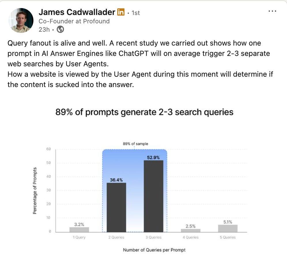 This week (yesterday, to be exact), James Cadwallader (Co-Founder at Profound) shared research showing that 89 percent of ChatGPT prompts trigger two to three web searches by the underlying User Agents.