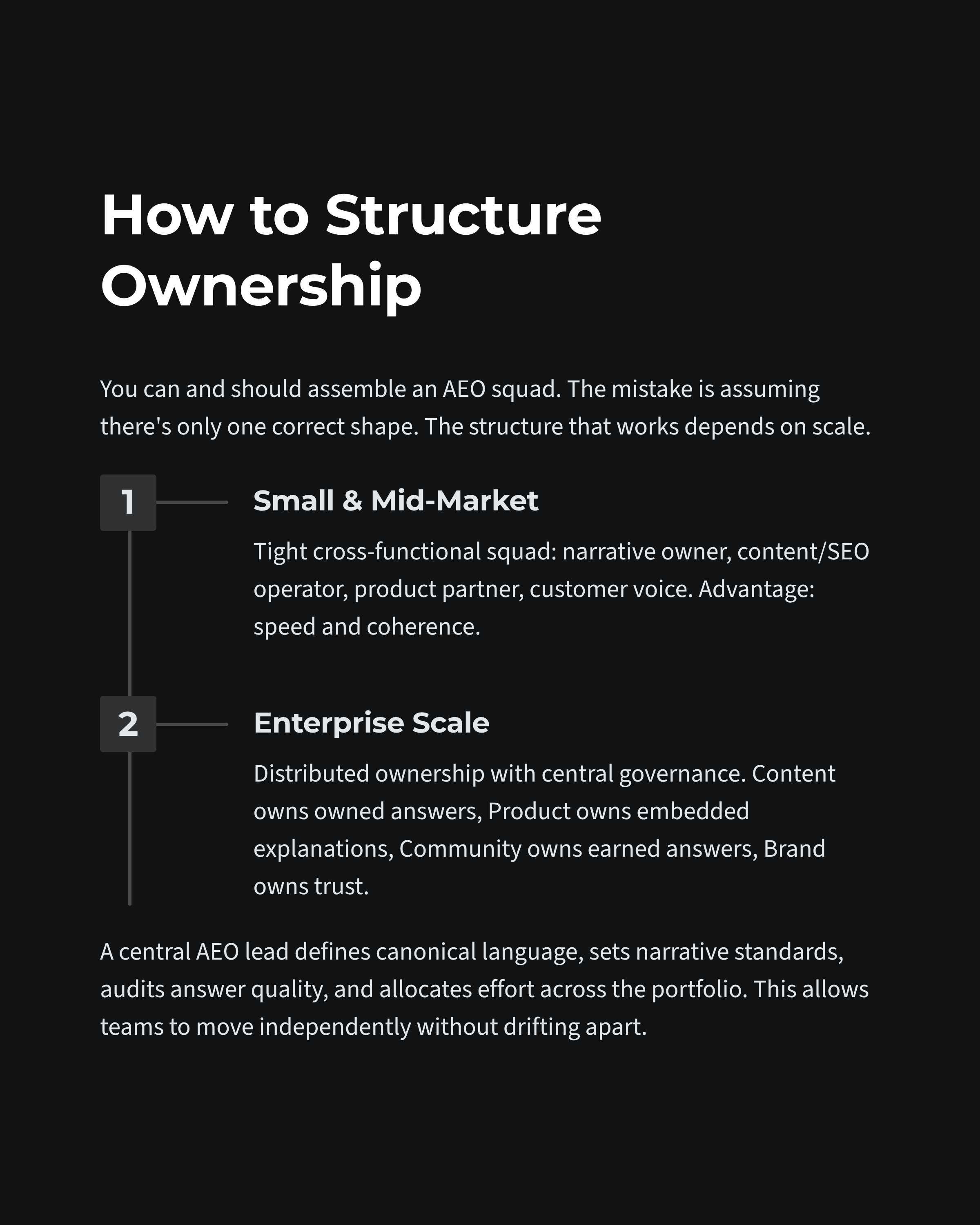 AEO does not fit cleanly inside a single function, channel, or roadmap. It cuts across how a company explains itself, how the product teaches users, how customers talk about it, and how third parties describe the category.