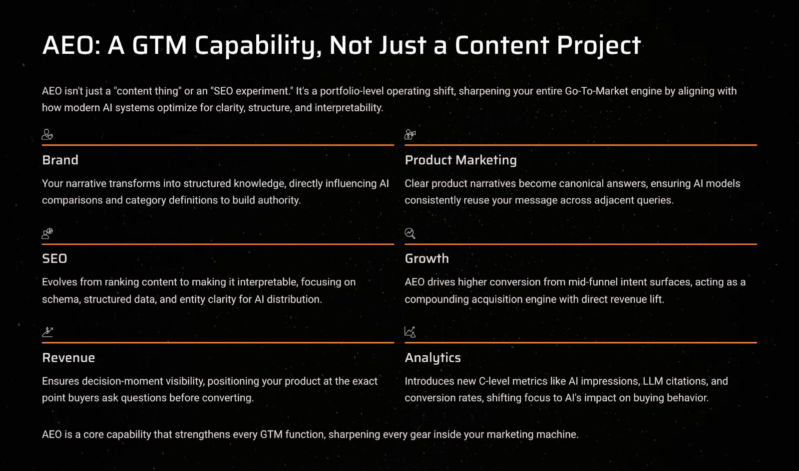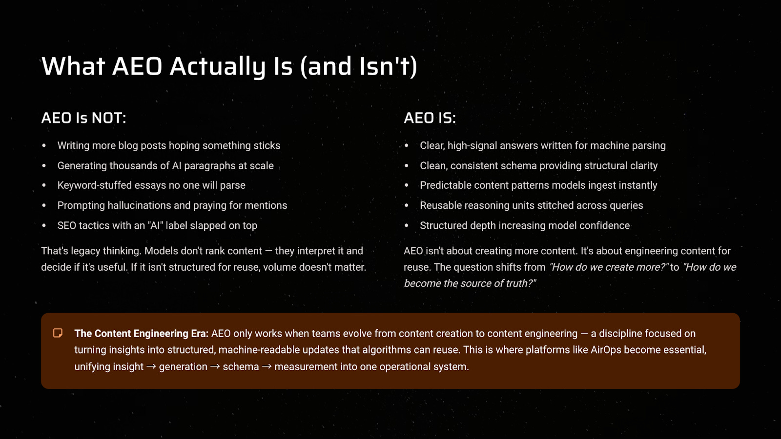 AEO only works when teams move from content creation to content engineering — a discipline focused on turning insights into structured, high-signal, machine-readable updates that algorithms can reuse.
