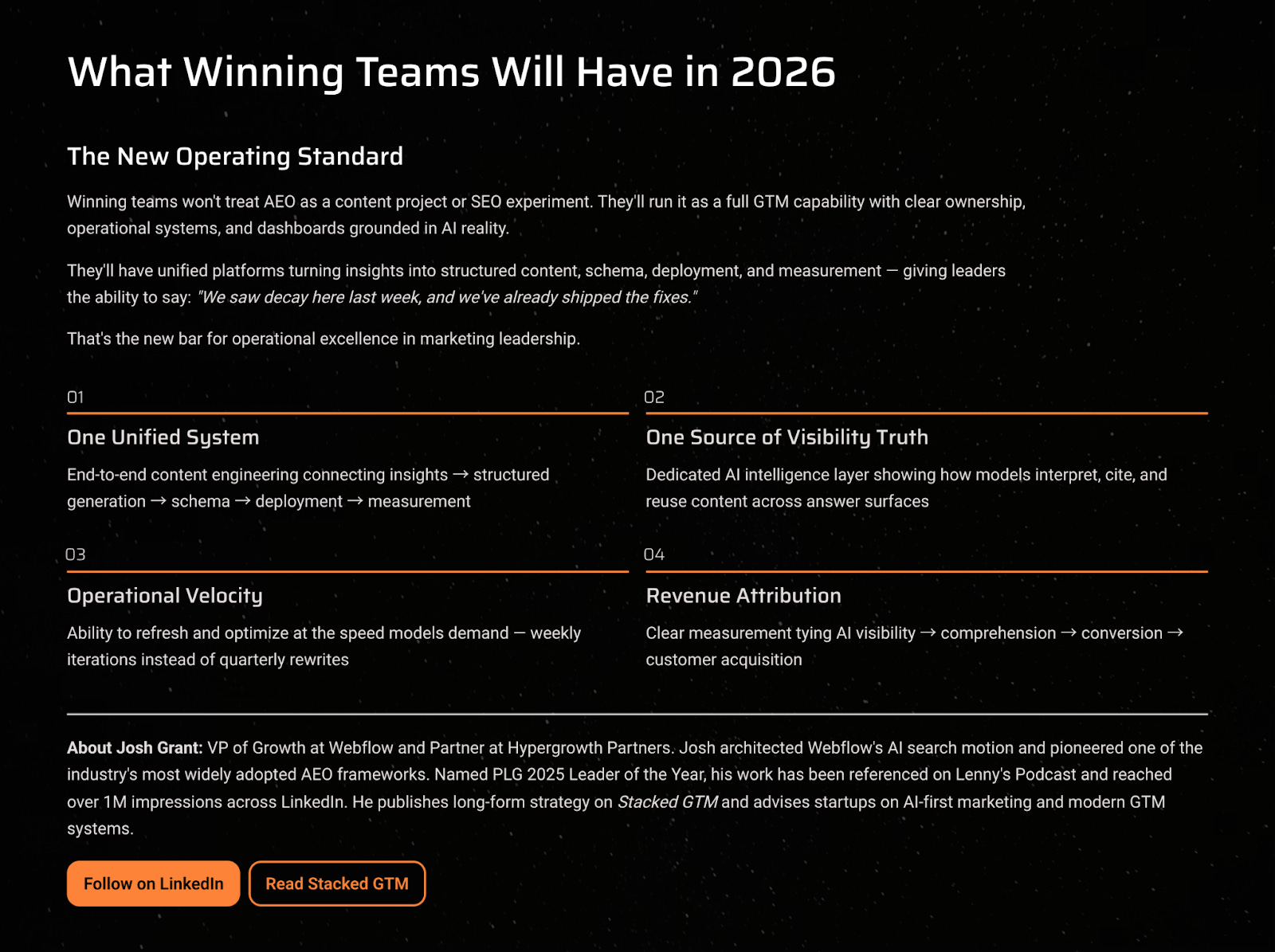 Josh Grant is VP of Growth at Webflow, where he leads Growth Marketing, Demand Generation, Lifecycle Marketing, Partner & Ecosystem Marketing, Marketing Ops, Analytics, and Webflow’s AI Search & AEO strategy. He architected Webflow’s growth engine and AI search motion, pioneering LLM traffic intelligence, enterprise-scale structured content systems, and one of the industry’s most widely adopted AEO analysis and optimization frameworks.